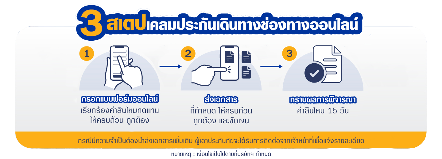 - ใบรายงานแพทย์ที่ระบุอาการสำคัญ ผลการวินิจฉัย และการรักษา (กรณีที่ต้องยกเลิกหรือเลื่อนการเดินทางเนื่องจากการบาดเจ็บหรือการเจ็บป่วยของผู้เอาประกันภัย การบาดเจ็บสาหัสหรือการเจ็บป่วยหนักของสมาชิกของครอบครัว) (ถ้ามี)